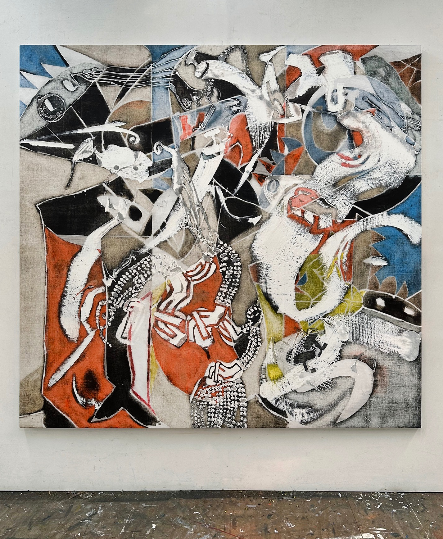 Magimagi, oil, oil stick, acrylic, charcoal, collage on linen 186 x 188.5cm